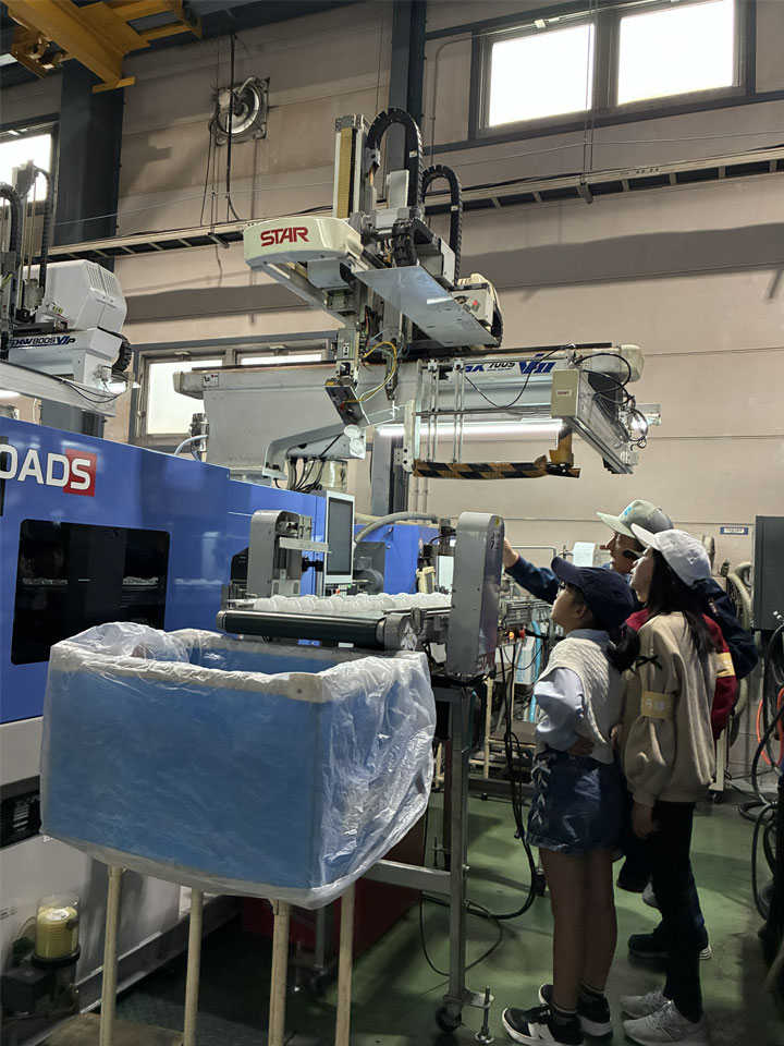 成形機に投入して溶けた材料が、金型に流し込まれて製品となって出てくるまでの流れを実際に見ることで、ふだんの生活で目にする沢山のプラスチック製品をより身近に感じる機会になったのではないかと思います。